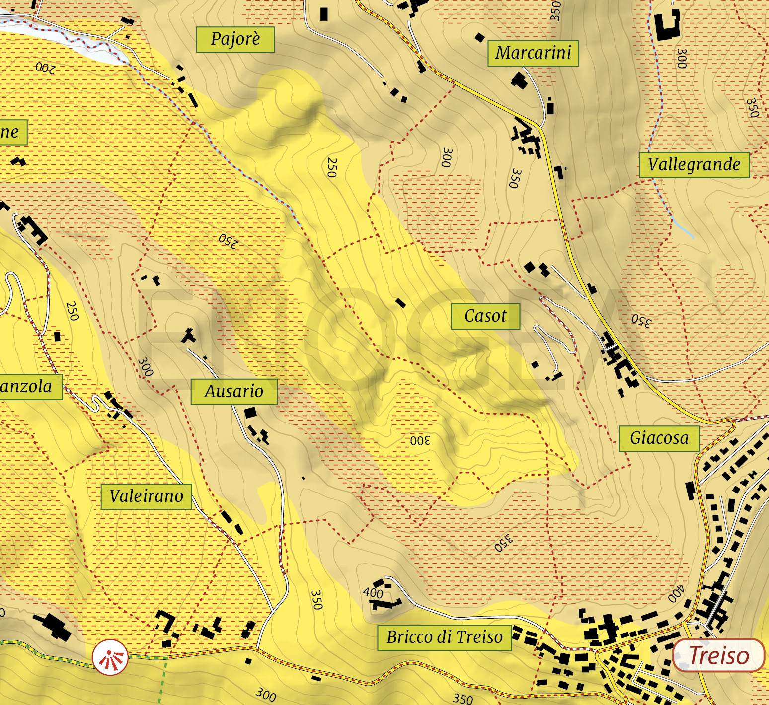 Questa zona, ritenuta non a torto una delle più interessanti di Treiso (e fra le primissime ad essere state rivendicate in etichetta), rappresenta il naturale prolungamento verso valle della parte più calda dei Giacosa. Esposizioni dunque simili, ma quote altimetriche inferiori e posizioni un po’ meno aperte che fanno preferire le vigne che dal confine con i Giacosa scendono fino alla borgata Casotto e verso il confine con i Marcarini. Prendendo come riferimento il Barbaresco della famiglia Nada, storico portabandiera di questa MGA, lo stile dei vini si distingue per la rigida eleganza, per la spiccata mineralità e dunque per il carattere.