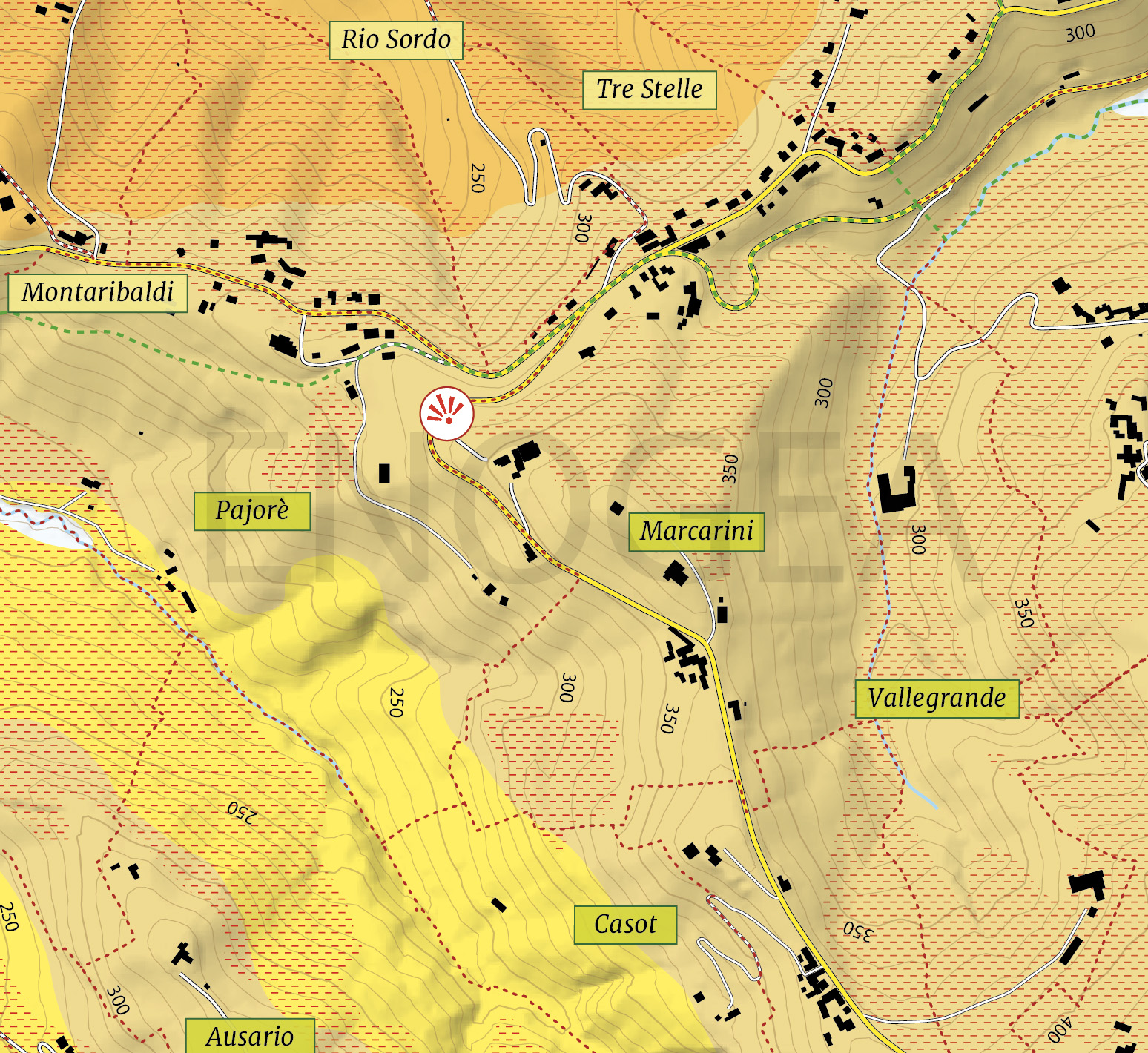 La menzione Marcarini può essere divisa in tre parti ben distinte:quella rivolta a ovest (prima immagine), dove al confine con il Pajorè e nella parte più bassa, conosciuta come Baudran, si hanno ottime posizioni da nebbiolo; il Monte Aribaldo (seconda immagine), sul quale domina la Villa Gresy e dove per tradizione era coltivato dolcetto nonostante l’ottima esposizione; e infine quella rivolta ad est (terza e quarta immagine), che si affaccia sulla Vallegrande. Meno marcate sono invece le differenze tra i vini oggi in commercio, che si distinguono per la loro impostazione spesso delicata e di immediata fruibilità.