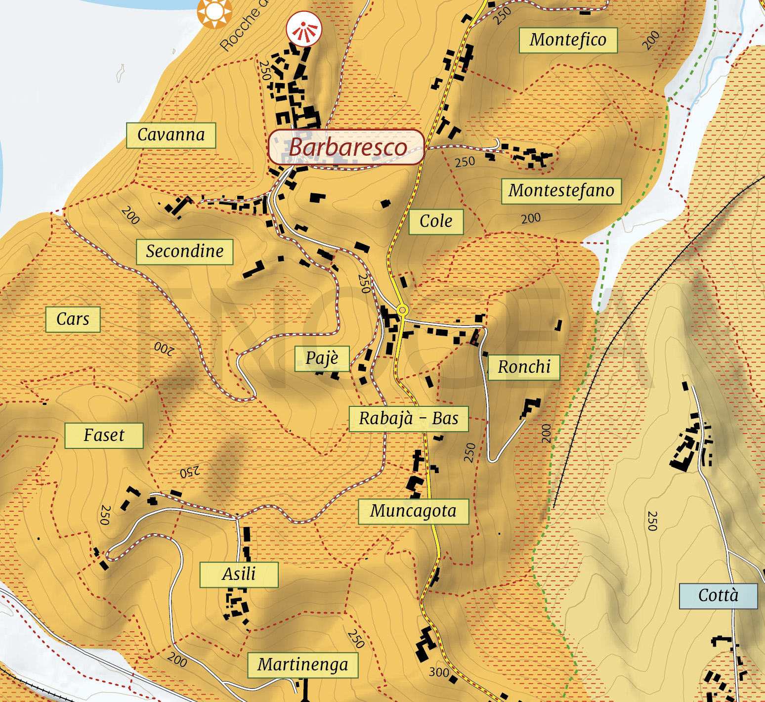 Seguendo la tradizione consolidatasi negli ultimi decenni, e così come accaduto anche per altre menzioni, il nome Muncagota (versione dialettale di Moccagatta) è stato esteso ad una zona un poco più ampia rispetto ai confini storici. Alle vigne che si estendono ai piedi dell’omonima cascina (e rivolti dunque verso Barbaresco e il fiume Tanaro), è stata infatti aggiunta anche una parte dei vigneti del versante orientale (rivolto verso Neive) e che rappresentano in pratica la parte più alta dei Ronchi. Specie nel primo caso, le esposizioni non possono dirsi tra le più calde del comune, ma nonostante ciò possono dare vini di buona struttura e carattere, così come dimostrato in più di un’occasione dal Bric Balin di Moccagatta (la cui parte più consistente arriva appunto da questo versante). Degno di nota è poi anche il Muncagota della Produttori del Barbaresco, che al contrario nasce in prevalenza dal versante rivolto a est.