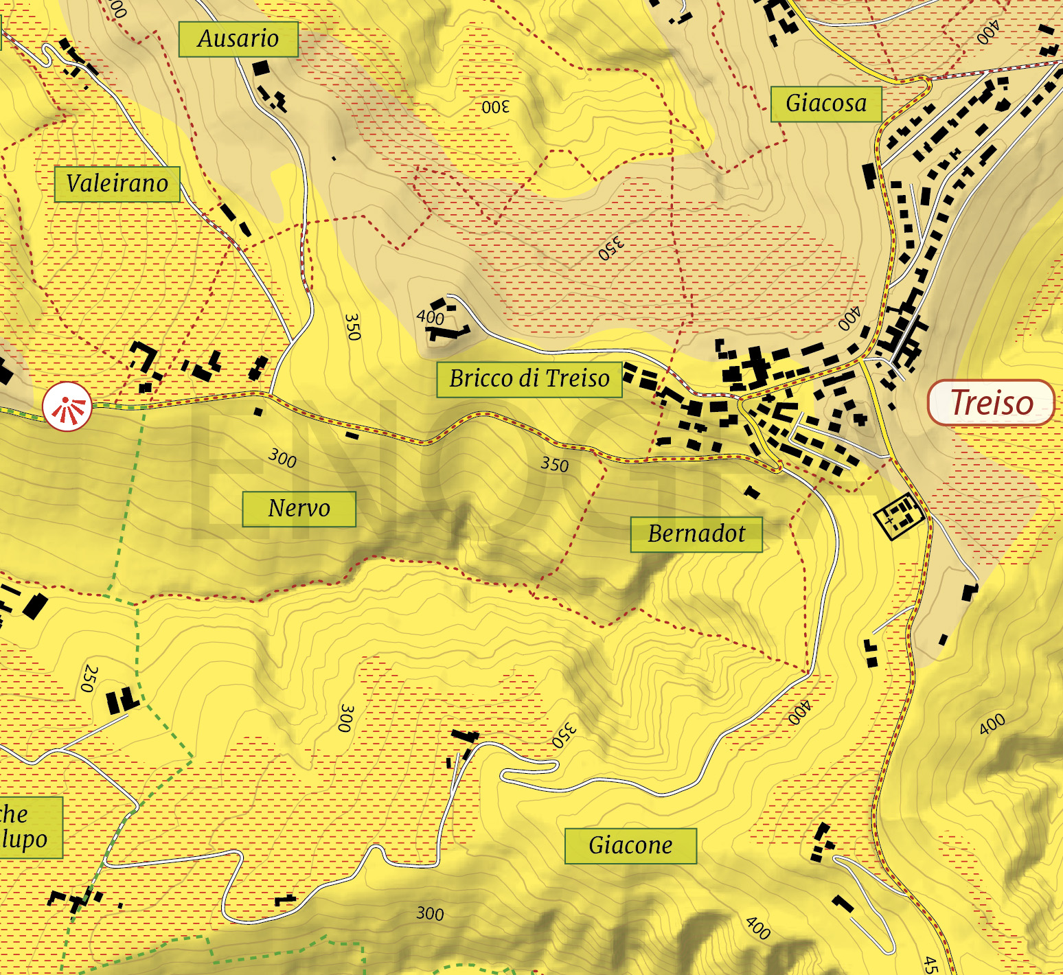 La menzione Nervo, naturale prolungamento del Bernadot da una parte e dei Rizzi dall’altra, può essere considerata il cuore di quel lungo versante che dalla cascina Boito arriva fino alle porte del paese di Treiso. Del tutto simili sono dunque le caratteristiche (leggi forti pendenze, ottima esposizione e qualità dei terreni) che ne fanno da sempre uno dei cru più rinomati di tutta Treiso. I vini, come quelli dei Rizzi, non hanno la struttura e la compattezza di altre menzioni, ma puntano più che altro sull’eleganza e la classicità (sebbene con un tocco di austerità tannica in più rispetto ai Rizzi).