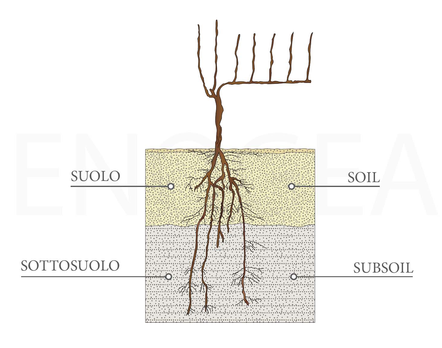 Come esplicitato nella figura riportata qui di seguito per suolo si intende lo strato superficiale del terreno in cui gran parte delle radici della vite o delle piante si sviluppa, mentre per sottosuolo o roccia madre si intende lo strato immediatamente sottostante.