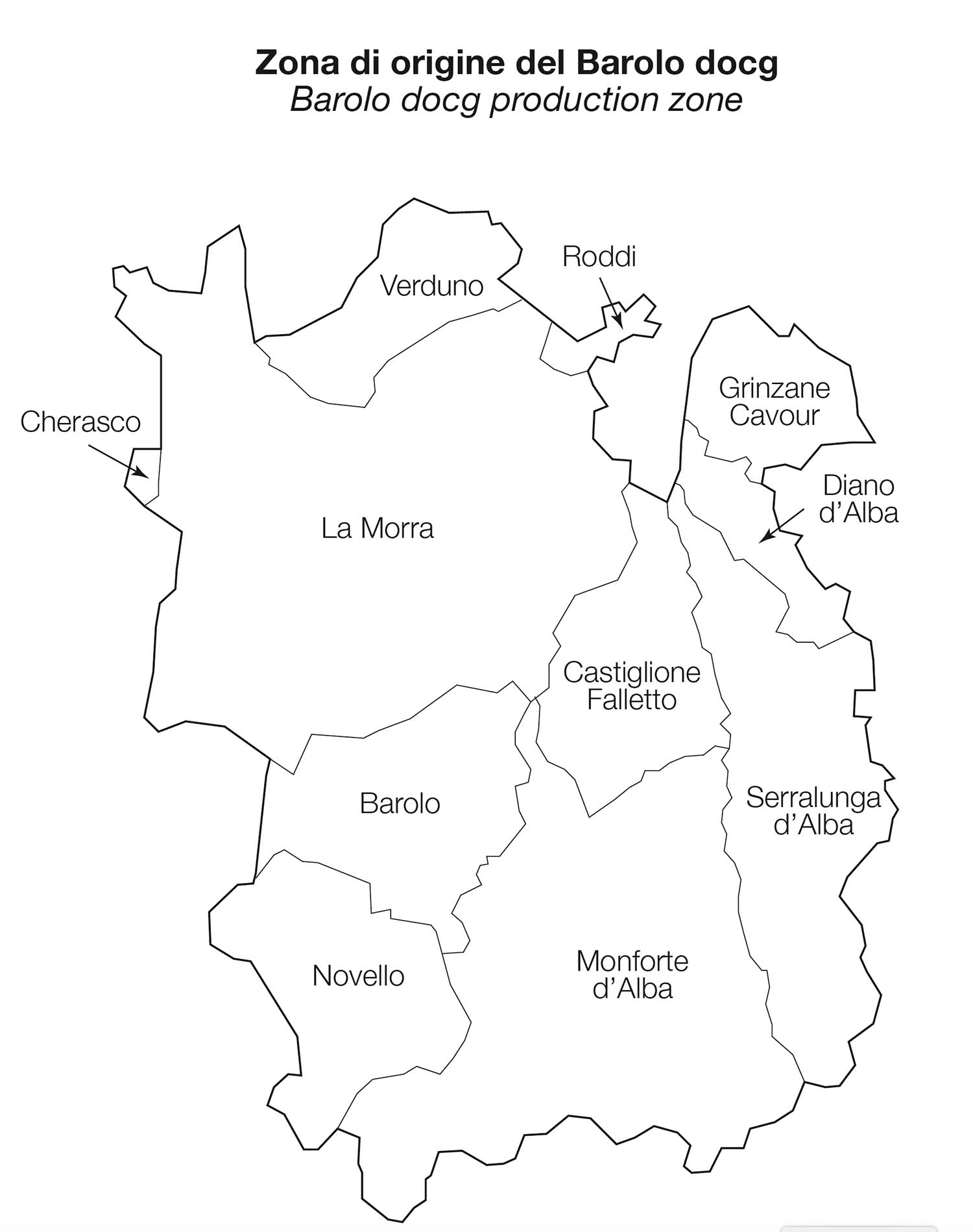 La zona di origine del Barolo, delimitata ufficialmente nel 1966 con il riconoscimento della Denominazione di Origine Controllata (DOC) e successivamente, nel 1980, con l’introduzione della Denominazione di Origine Controllata e Garantita (DOCG), è ancora oggi invariata e interessa il territorio di 11 diversi comuni: Barolo, Castiglione Falletto e Serralunga d’Alba, che vi rientrano per intero, oltre a Cherasco, Diano d’Alba, Grinzane Cavour, La Morra, Monforte d’Alba, Novello, Roddi e Verduno, che vi rientrano invece solo in parte.