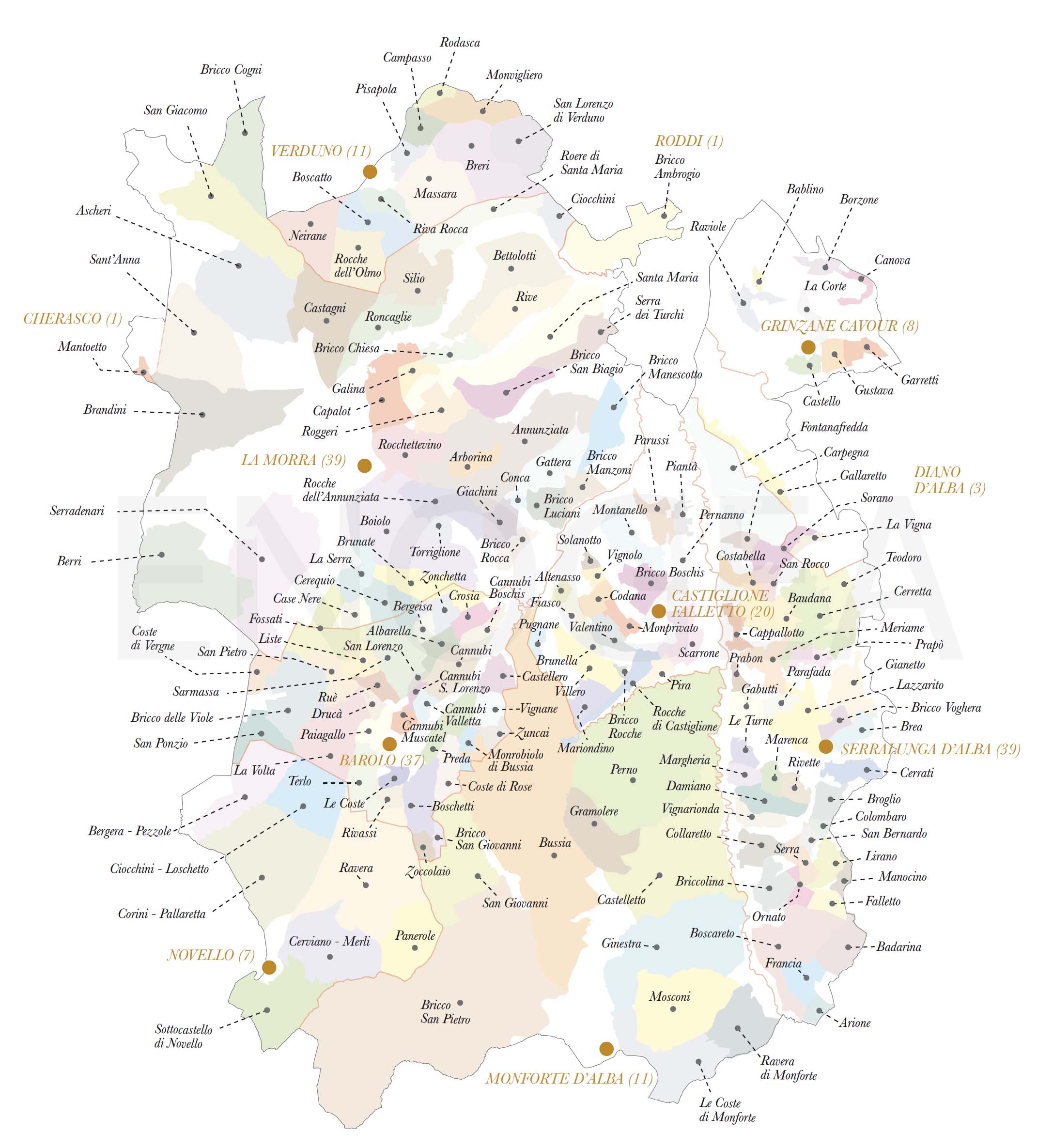 Per quanto bizzarro possa sembrare, la legge europea impedisce l’uso contemporaneo di due o più MGA in etichetta, cancellando così di fatto la tradizione nobilissima e documentata del Barolo ottenuto dall’assemblaggio di più vigne. Per contro, nel caso le MGA appartengano allo stesso comune, in etichetta può essere specificato “Barolo del Comune di Barolo”, “Barolo del Comune di La Morra” ecc.