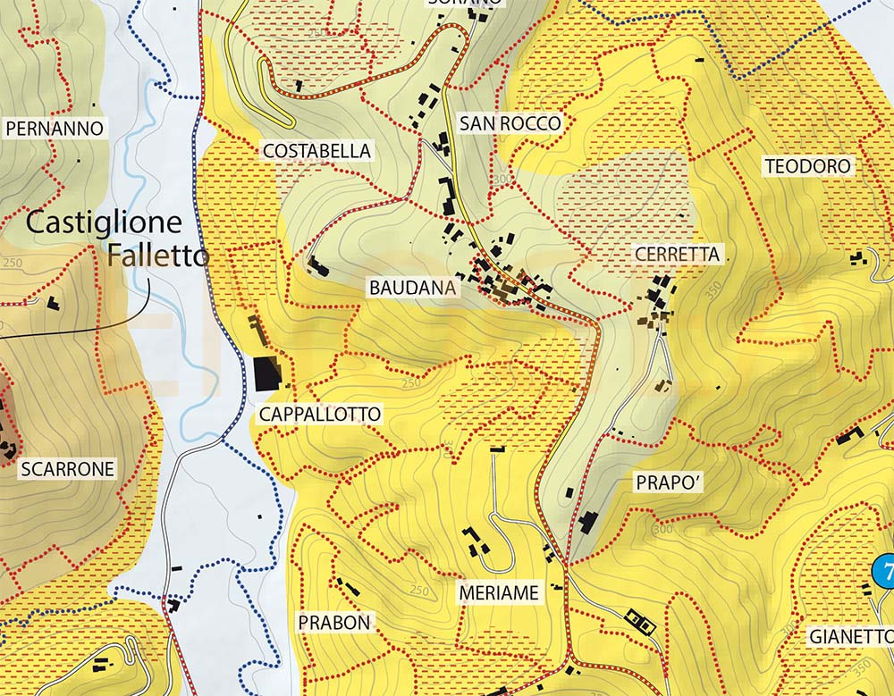 Perché questo passaggio di mano sia avvenuto è difficile dirlo, ma sta di fatto che chi ha deciso di venire qui ha scelto sicuramente bene (pochi lo sanno ma Baudana è citata tra le zone di pregio nella carta di Renato Ratti). In particolare chi ha vigneti sul versante meridionale, ripido, bene esposto, con suoli giovani su Formazione di Lequio e in misura minore su Marne di Sant’Agata Fossili tipiche. Più fresco, meno conosciuto e molto simile a Cerretta Piani (vedi la scheda della MGA Cerretta) è invece il versante opposto, visibile nella seconda immagine interattiva. Unico esempio di suoli evoluti è infine il triangolo di vigne con esposizione ovest di proprietà di Luigi Baudana e da cui proviene il Barolo che da più tempo porta il nome della MGA.