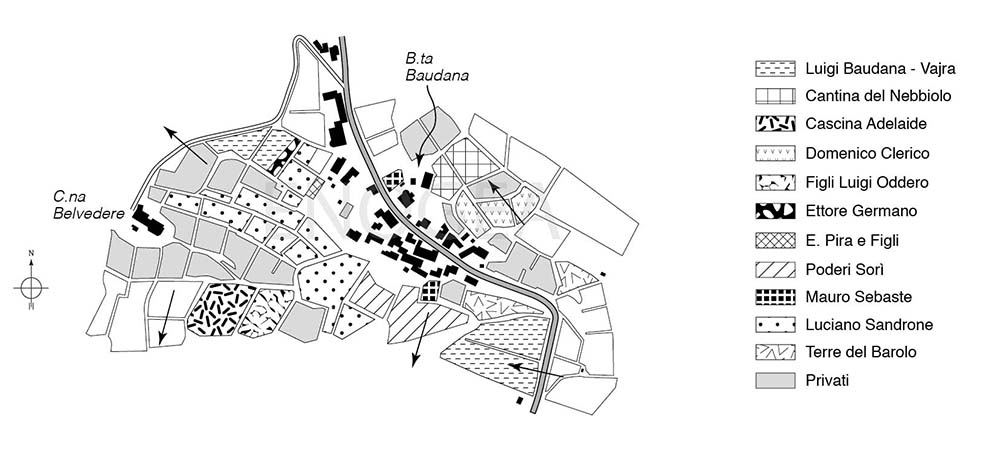Infatti, come si può vedere nella planimetria in bianco e nero, se escludiamo Ettore (Sergio) Germano e Luigi Baudana, che da diversi anni fa comunque riferimento alla cantina Vajra di Barolo, il resto dei vigneti è nelle mani di aziende con sede in altri comuni.