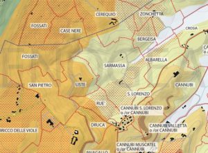 A sinistra abbiamo invece due lingue di vigneti ben distinte: una al fondo del crinale delle Liste, in cui prevalgono i suoli giovani, e un’altra invece subito sotto Rué dove al contrario prevalgono i suoli evoluti. Da quest’ultima zona e dai vigneti appena sotto la strada che porta alla cascina Sarmassa proviene il Barolo Sarmassa della cantina Giacomo Brezza e Figli, che come è giusto attendersi ha in genere un po’ più di volume e un tannino particolarmente gustoso.