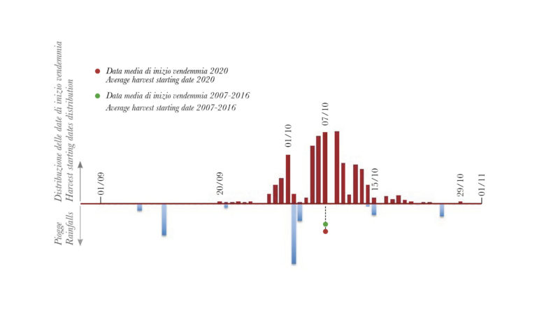 Perhaps even more significant, however, are the rough data hidden behind the graph of the distribution of harvest starting dates, whose boundless nuances can only be grasped during the analytic phase. What first seems to emerge clearly is that in 2020 the harvest dates of the various crus were more spaced out than usual (in recent years, many producers have made it a practice to harvest various vineyards one after the other without a break in between). At the same time, several wineries, accustomed to harvesting a vineyard in a single phase, preferred to make two or more selections in 2020, whether due to exigencies related to the vintage or to carry out experiments.